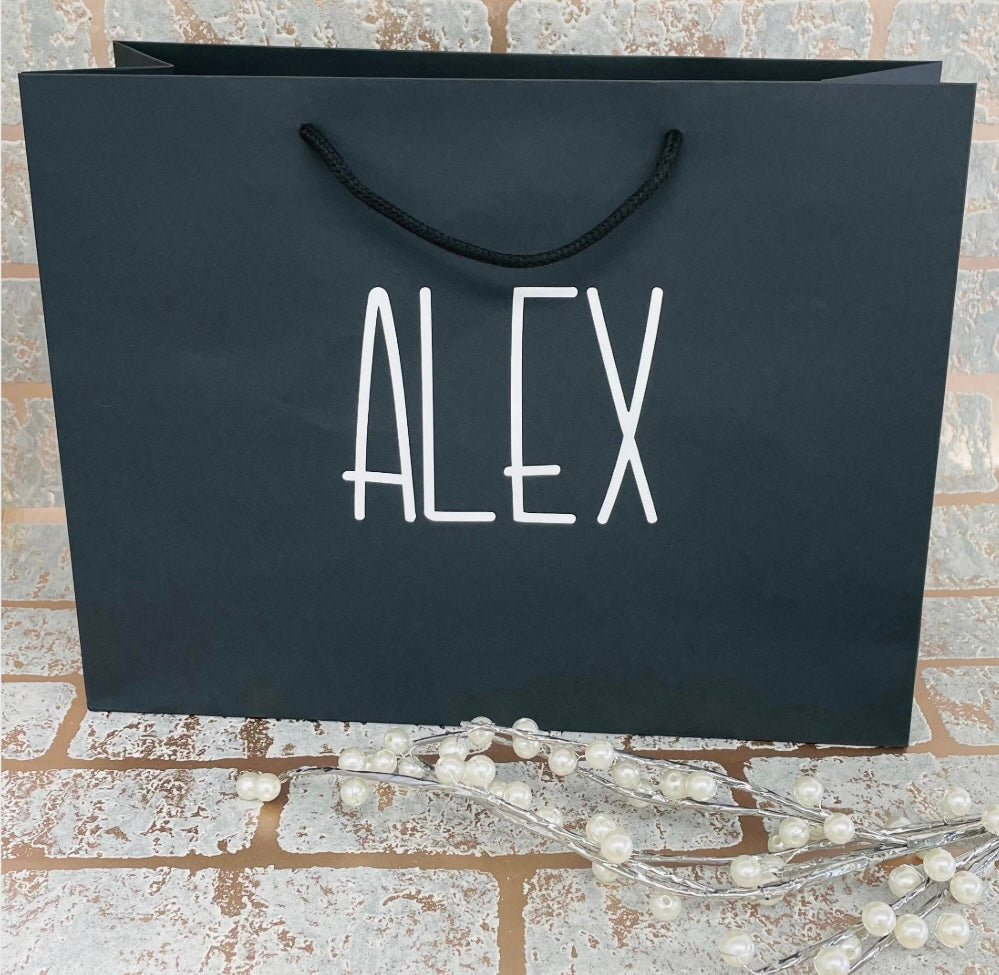 Our bags come with different colour fonts, our standard colours are as follows, white gift bag will come with gold font, kraft gift bags with come with black font and grey and black gift bags will come with white font as standard.